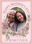 Front of card: Flower Fairies Photo Upload Mother's Day Card Illustration of a fairy perched among flowers with an oval photo frame. Text reads: "Happy Mother's Day to an amazing Godmother". 'Godmother' can be personalised!