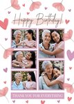 Front of card: Featuring five photo frames surrounded by hearts and flowers. Text reads: "Happy birthday! Thank you for everything". 'Thank you for everything' can be personalised!
