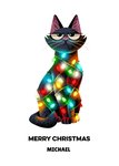 Folio Illustration of a frowning cat tangled up in Christmas lights. Non editable caption reads: "Merry Christmas" with an editable name underneath, that reads: Michael". The rear of the card has a white background with both the Folio and Moonpig logos.