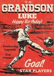 Front of card: Illustration of football player striking a goal on red background, surrounded with captions 'Footballing Legends!' 'Cup Winners' 'Goal!' 'Star Players'. Card reads: To my Grandson Luke Happy Birthday! With customisable options.