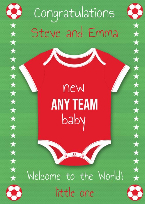 "Congratulations Steve and Emma new any team baby welcome to the world! Little one". 'Steve and Emma', 'any team' and 'little one' can be personalised!