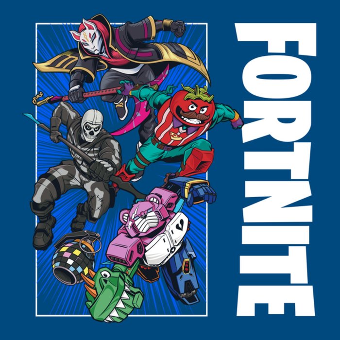 Featuring illustrated Fortnite characters in action poses with bold white Fortnite lettering on the right, on a dark blue background.