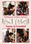 Front of card: Christmas Photo Upload Card Four decorated photo frames on a pink background. Text reads: "Wishing you a very Merry Christmas Nanny & Grandad". All text can be personalised!