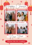 Front of card: Chinese New Year Photo Upload Card Four photo frames with handwritten typography surrounded by lanterns and blossom. Text reads: "Happy Chinese New Year", "year of the rabbit" and "from the Wu family". 'Year of the rabbit' and 'from the Wu family' can be personalised!