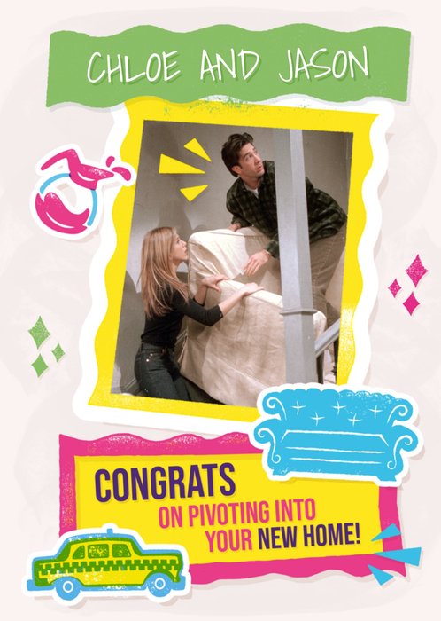 Front of card: Featuring a photograph of Rachel and Ross pivoting a sofa up the stairs. Text reads: "Chloe and Jason congrats on pivoting into your new home!". 'Chloe and Jason' can be personalised!