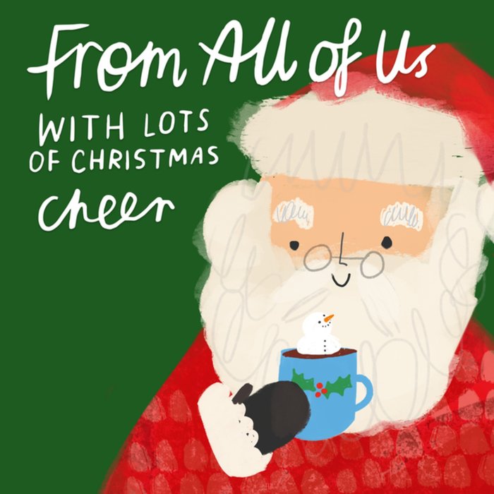 Featuring a jolly illustration of Santa holding a blue mug topped with a marshmallow snowman, on a dark green background.