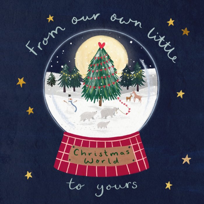 Featuring a snow globe with a decorated Christmas tree, a snowy forest, a snowman and woodland animals. The illustration is surrounded by scattered gold stars and sits on a deep navy coloured background.