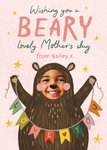 Front of card: Featuring a cute illustration of a bear cub with text above them. The bear is holding bunting that reads 'love you.' The bear's face has a photo upload area for you to add your face. Text reads: "Wishing you a beary lovely Mother's Day, from Bailey x."