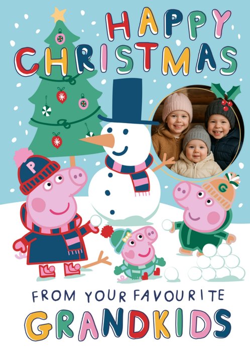 Featuring a festive Peppa Pig–themed snowy scene with a decorated Christmas tree, a snowman, and Peppa Pig characters playing with snowballs. A single circular photo upload frame appears on the right. Bright, colourful lettering appears at the top and bottom of the design.