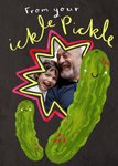 A fun and playful card featuring two illustrated pickles with smiling faces on a dark textured background. A bright, star-shaped photo frame allows for a personal photo upload, adding a cute and sentimental touch. Ideal for children to gift a father or grandfather, the card uses childlike handwriting and vibrant, quirky design elements to convey affection and humour.