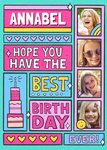 A fun and bold Photo Upload Birthday Day card featuring a hand-drawn comic strip layout with panels containing text and images, several of the different-sized rectangles include; handwritten block lettering, love hearts and a rudimentary three-tier birthday cake with one candle in the top. The design is in a bright, feminine colour palette. There are four photo upload areas going down the right side of the design.