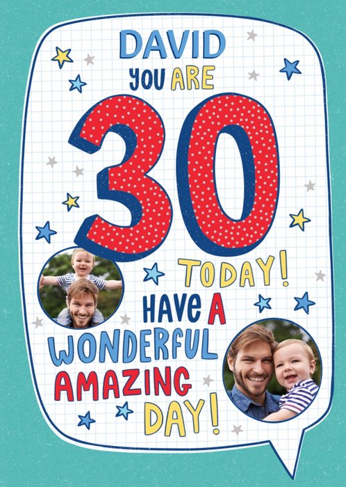 Front of card: 30 Today! Photo Upload Birthday Card Fun and colourful typography with two circular photo frames in a speech bubble. Text reads: "David you are 30 today have a wonderful amazing day". 'David' can be personalised!