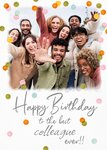Front of card: Large photo upload area, surrounded by colourful confetti on a white background, with text below. Text reads: "Happy Birthday to the best colleague ever!!"