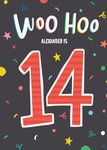 Front of Card: Fun design with colourful illustrated confetti. Big red, stripey 14 and typography in center on dark grey background Text reads: WOO HOO ALEXANDER IS 14 With customisable name.