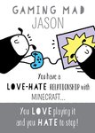 Text reads: "GAMING MAD JASON. You have a love-hate relationship with Minecraft... You love playing it and you hate to stop!"