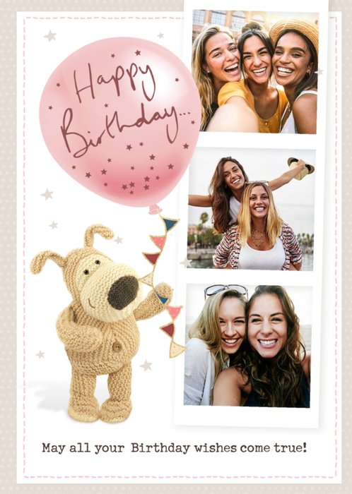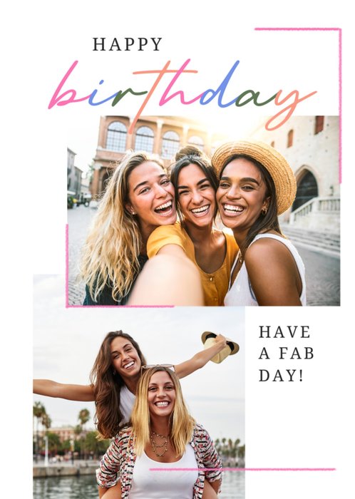 Front of Card: Fun illustrated characters with champagne glass and floral photo frame Text reads: "THE MANY STAGES OF LIFE: 1. Young Woman... 2. Young Woman... 3. Young Woman... (I think you get the idea) HAPPY BIRTHDAY OLIVIA!" With editable name and photo upload option.