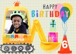 A cute and fun Birthday Card featuring a hand-drawn illustration of a construction digger carrying a stack of Birthday presents, the digger is decorated with colourful bunting, and there is also a traffic cone with party balloons attached, this is where the Birthday age number goes. There is a photo upload area inside the cabin of the digger.