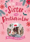 Front of card: Sister And Brother-In-Law Photo Upload Christmas Card Fun typography with a circular photo frame surrounded by snowflakes and foliage on a pink background. Text reads: "To the best sister and brother-in-law Merry Christmas".