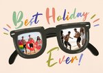 Front of postcard: Featuring a pair of illustrated sunglasses with photo upload areas for each eye of the glasses. The typography is in a multi-coloured handwritten script.
