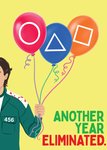 Bright Graphic Illustration of balloons with symbols from a popular fictional dystopian TV game show printed on them, held by a contestant in a green tracksuit. Card reads: Another Year Eliminated.