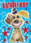 Funny Cartoon Illustration Of A Dog Smiling Surrounded By Stars Birthday Boy Card