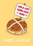 Front of card: Featuring a drawing of a large hot cross bun with a sign sticking out the top, on a yellow background. Text reads: "Girls just wanna have buns. Happy Easter."