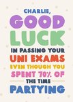 This humorous card features colorful and playful text, it offers good luck wishes for passing university exams, despite spending a significant amount of time partying.