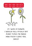 A funny and cute Valentine's Day card featuring a humorous cartoon of a couple of daisy flowers, the one on the left is pulling its petals out one by one while exclaiming its love to the one on the right.