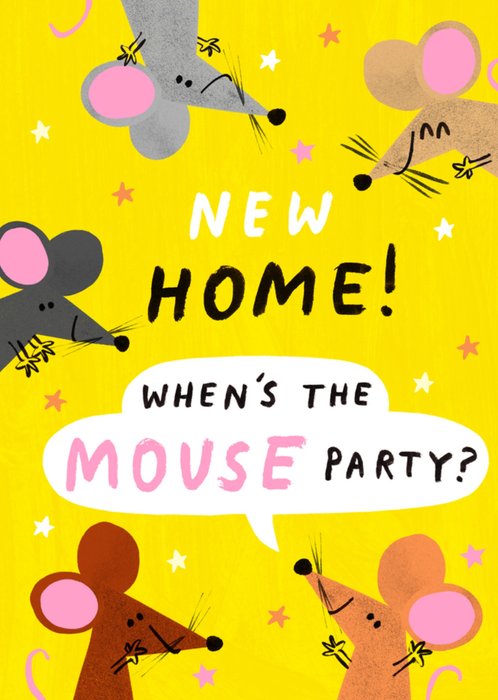 Featuring five cute, illustrated mice around the edge of the card surrounded by small stars on a bright yellow, textured background. In the centre is a speech bubble with playful, hand lettered typography.