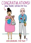 Front of card: New Baby Congratulations Card Funny illustration of a woman eating and a man with drink. Text reads: "Congratulations! Now you're eating for two, and drinking for two!".