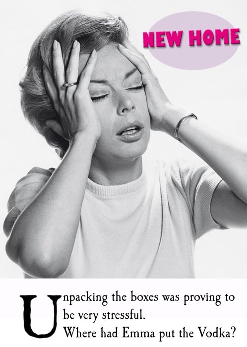 Funny New Home Congratulations Card - NEW HOME - Unpacking the boxes was proving to be very stressful. Where had Emma put the Vodka?