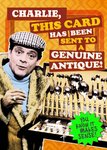 Front of card: Funny Photographic Del Boy Genuine Antique Birthday Card. Features Del Boy holding a cutlery set in front of a retro orange background. Text reads:"Charlie, This Card Has Been Sent To A Genuine Antique!". Charlie is customisable.