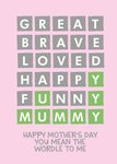 Front of card: Wordle illustration with words 'great' 'brave' 'loved' 'happy' 'funny' and 'mummy' spelt out Text reads: "Happy Mother's Day you mean the wordle to me".
