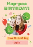 Front of card: A sweet and funny Birthday card featuring a hand-illustrated happy cartoon pair or peas, one is holding a balloon while the other is sitting on the edge of the frame. There is one photo upload area both peas overlap the frame.