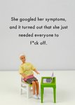 Front of card: Funny photograph of a female doll sitting at a laptop Text reads: "She googled her symptoms and it turned out that she just needed everyone to get lost."> Back of card: Bold and Bright logo. Moonpig logo