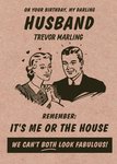 Front of card: Illustration of a man and woman holding hands surrounded by love hearts with black typography on brown background Text reads: "ON YOUR BIRTHDAY, MY DARLING HUSBAND TREVOR MARLING REMEMBER: IT'S ME OR THE HOUSE. WE CAN'T BOTH LOOK FABULOUS!" With editable text.