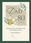 Front of card: Dad's 80th Birthday Card Garden themed illustration of a watering can, spade and plants on a cloth textured background with a green frame. Text reads: "For you Dad on your 80th Birthday" and "Wishing you a day filled with everything you love from Pauline x". 'Wishing you a day filled with everything you love from Pauline x' can be personalised!