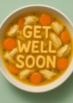 A greeting card featuring a white bowl of chicken soup with alphabet noodles and carrot slices, viewed from above and centred on a soft mint green background.