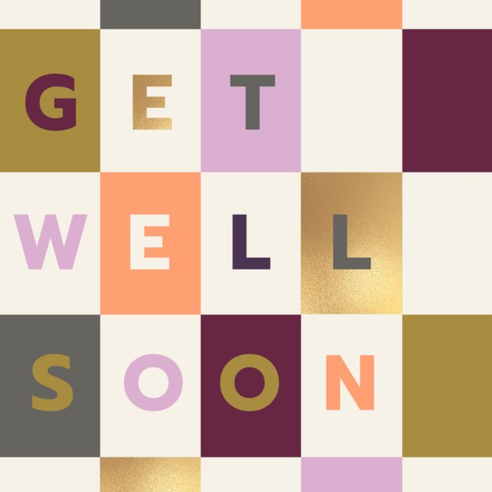 Featuring bold block letters arranged to spell a get well message, on a grid background in muted colours with gold foil elements.
