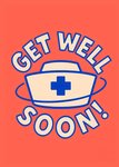 A greeting card featuring a cream nurse’s cap with a blue medical cross and swooshing lines, centred on a solid coral-orange background.
