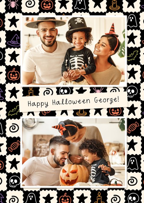 Featuring two central photo frames and editable text, sitting on a playful Halloween icon themed patterned background, depicting ghosts, skulls, witches' hats, bats and stars.
