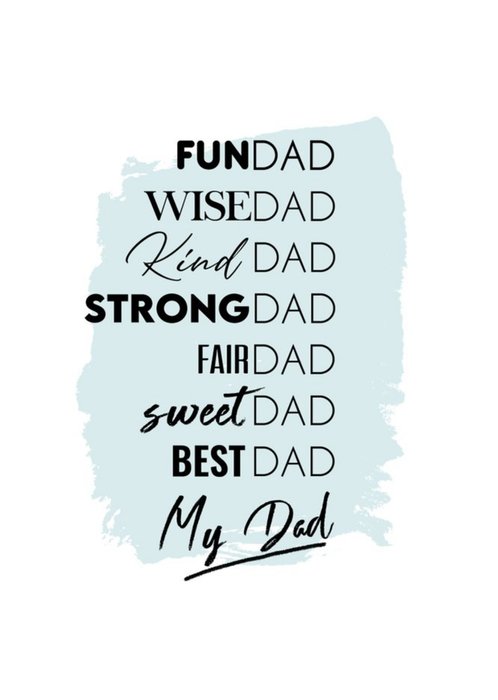 Gift Delivery typographic card for your Dad. The non editable caption reads Fun Dad, Wise Dad, Kind Dad, Strong Dad, Fair Dad, Sweet Dad, Best Dad, My Dad. The card background colour is white with a pale blue brush stroke panel.