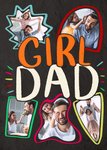 A joyful greeting card with a black background features six playful photo frames in various shapes around the bold, colourful text "Girl Dad" in orange and off-white lettering, surrounded by vibrant doodle-style lines.