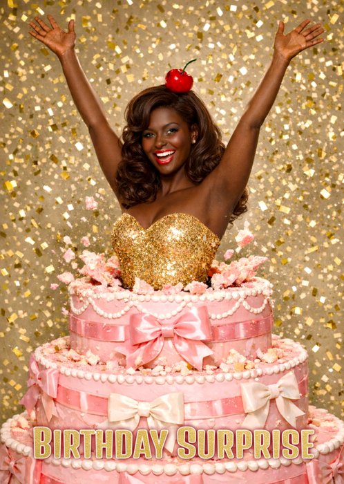 A humorous design featuring a glamorous, smiling lady with a large cherry on her head and her arms in the air, popping out of a pink, tiered Birthday cake being showered by gold confetti.