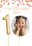 Front of card: Featuring a large gold balloon in the shape of the number 1 with a round balloon shaped photo upload next to it. Above is pink and orange confetti and orange text.