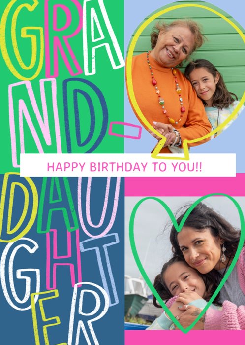 Featuring bold, outlined Granddaughter lettering & 2 photo frames, each with its own shape and outline colour, all on a multicoloured background.