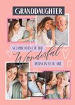 This greeting card design features a soft peach background with the text “Granddaughter” prominently displayed at the top in a bold serif font against a dark rectangle. Below, the message “So proud of the wonderful person you are” is written in elegant cursive and serif typography on lavender text boxes. The design includes five rectangular photo upload areas: two on the top half, side by side; one in the bottom left; one in the bottom centre; and one in the bottom right. The layout is embellished with white hand-drawn hearts scattered across the card, adding a loving and playful touch.