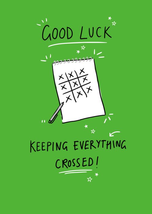 This greeting card features a hand-drawn notepad with a grid of crosses and a pen, surrounded by small stars and lines, all set on a solid green background.