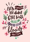Front of card: Sweet Mother's Day Card Hand written typography surrounded by flowers on a pink background. Text reads: "Even though you didn't give birth to me your'e still bloody awesome".