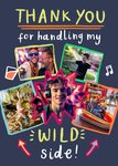A vibrant greeting card full of energy, with five playful photo areas in different shapes and colours, surrounding a bold message that thanks someone for dealing with your wilder side.